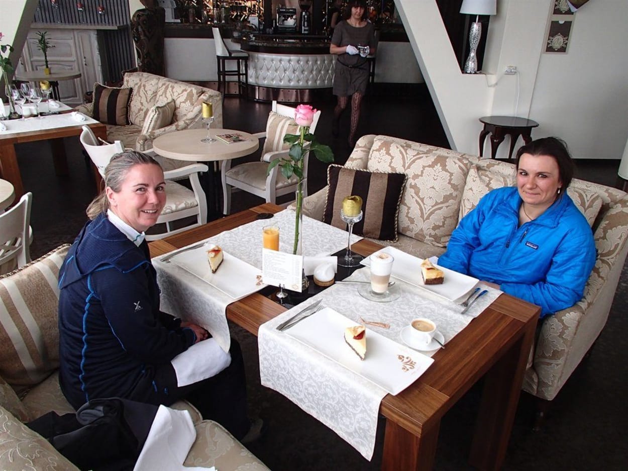 10th April :- Delay of a day in departing because of the lost migration paperwork. Richard and I have to travel back to the capital of Kamchatka, Petropavlovsk, by bus to sort it out. The others go skiing at the local ski centre and Elena spends the day with us helping translate and takes us to a really really posh tea place to have cheese cake and coffee. The waitress wore gloves!! Anyway paperwork all sorted by very friendly staff, nothing to worry about. We head out to a restaurant to join some guests that are staying at Marthas place for dinner.