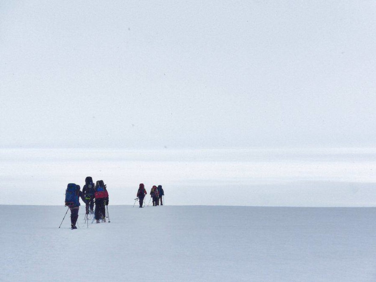 We packed up camp early intending to go to the Laguna Ferrari that day. As we set off south we met very strange conditions. The upper 30cm layer of snow had turned to slush in the warm weather. There was no consolidation of the icepack. It was almost like wading ankle deep through shallow lagoons. Difficult conditions not only arduous to walk through for hours on end, but also the constant cold and wet in the boots made life very uncomfortable. Hidden dangers too with no idea what lay beneath the water. Solid ice or lurking crevasses?