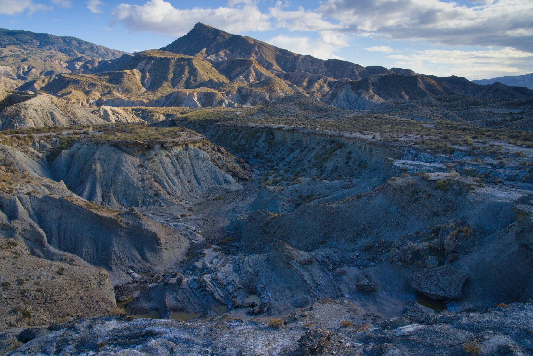 Last of the evening sun illuminates the torn, twisted and chaotic upheaval that comprises the Desierto del Gorafe. In the distance, the snow capped peaks of the Sierra de Cazorla.