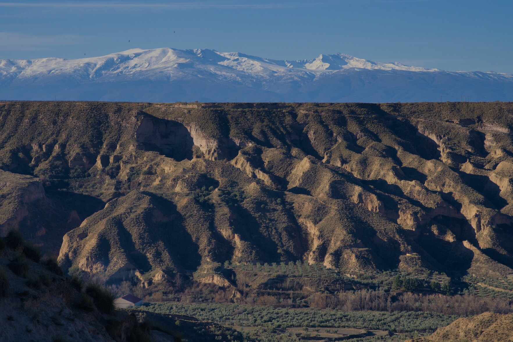 The illusion in a photograph. The top 3rd of the image shows the Sierra Nevada which rise some 3000m above the plains of Guadix (marked by the obvious horizontal line). The bottom 2/3rds of the image into the fertile valleys near Gorafe represent a mere 200m altitude difference.