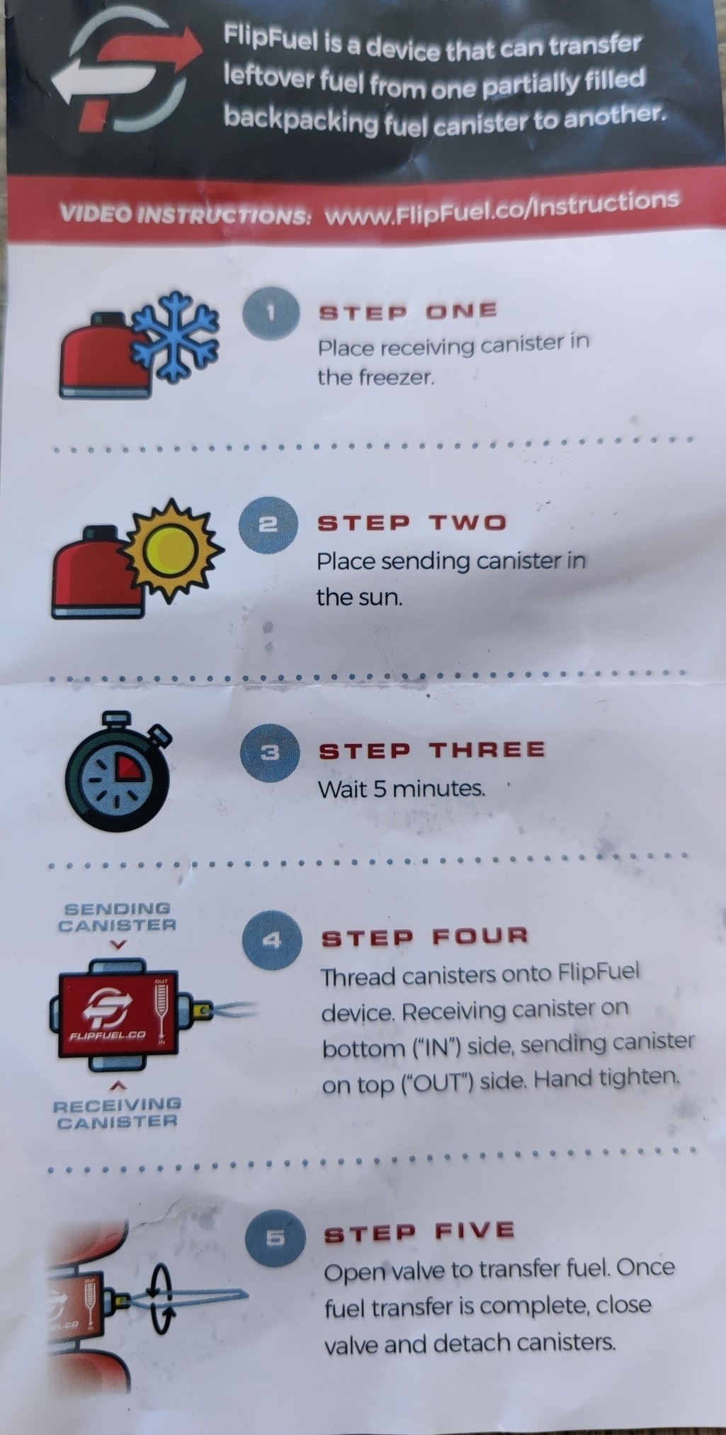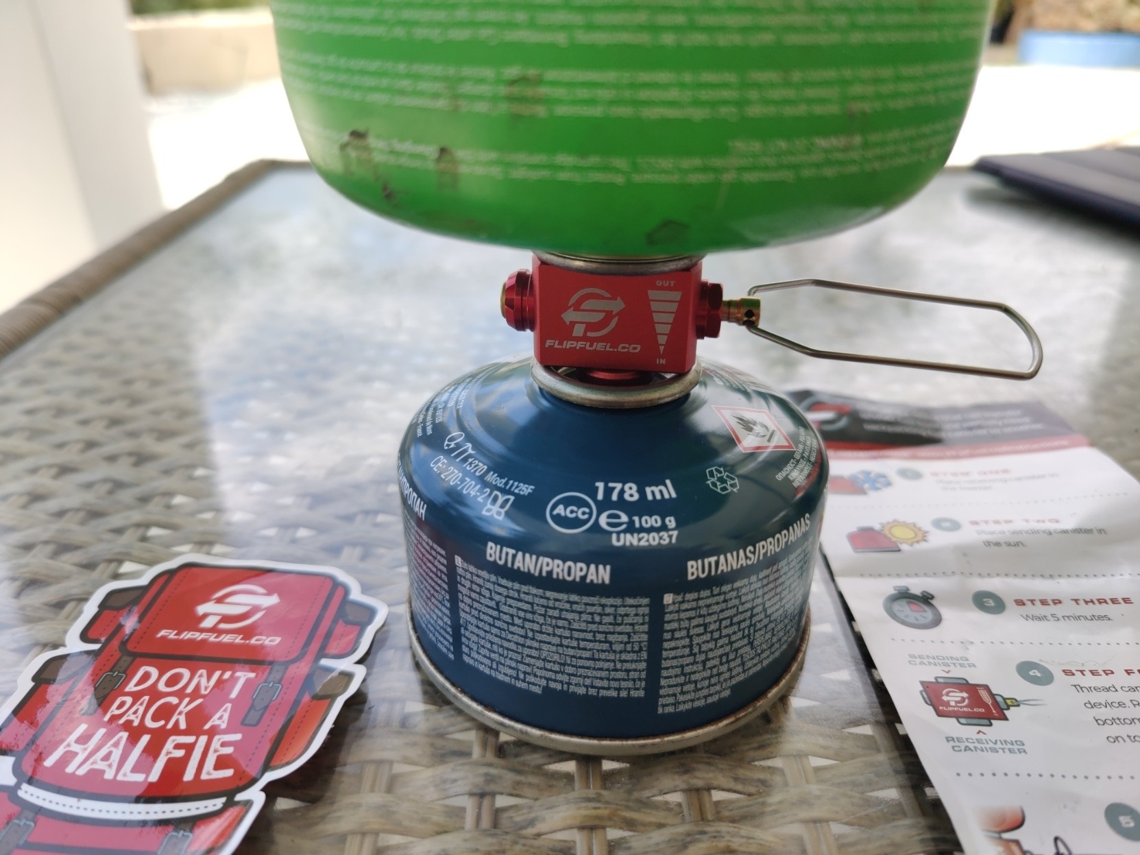 "Don't Pack A Halfie"! Been transferring half empty gas cannisters to top up my small ones. Really works well using the Flip Fuel from https://flipfuel.co
